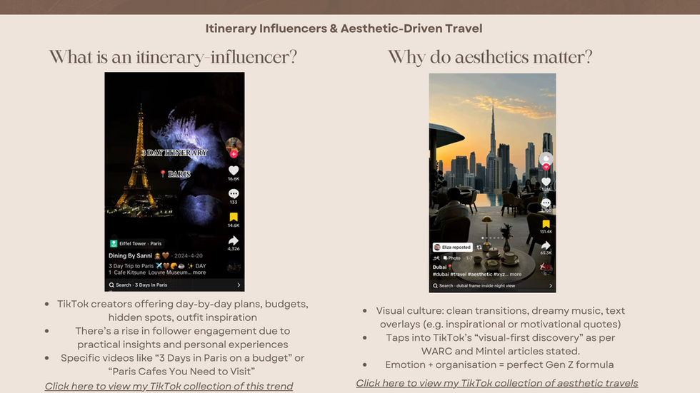 Using reflection, design, and trend research, I developed a full personal brand guidelines presentation, a TikTok travel trend report, and a reflective report using Driscoll's model.